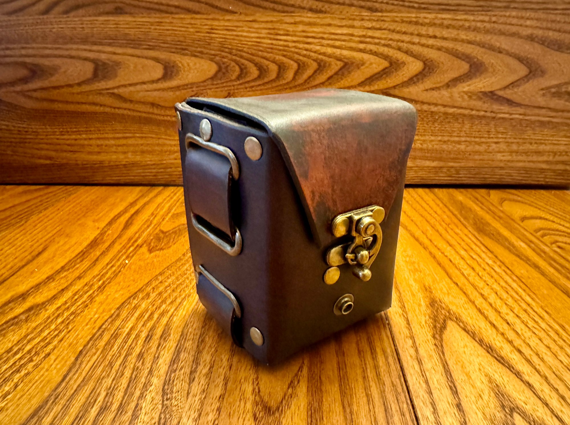 100% handmade, hand dyed leather deck box, designed for Magic the Gathering and other trading card games.